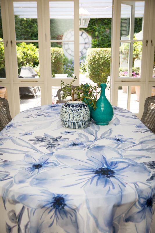 Dahlia Blue On White Material Tablecloth